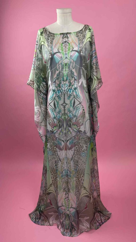 I think I have come up with a great silk caftan pattern that is easily replicated regardless of the client size. I made it using my favorite ethereal green silk fabric and because of its delicate nature, didn’t add any ruffles or trim to the caftan. I think it’s best in the boatneck neckline due to the complexity of the fabric.