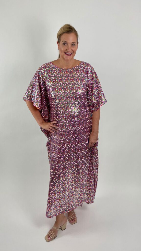 I also made the Charlie Dress into a pink sequin caftan, and it’s super fun. I lined it in Flowers get all the powers so there is no itch!