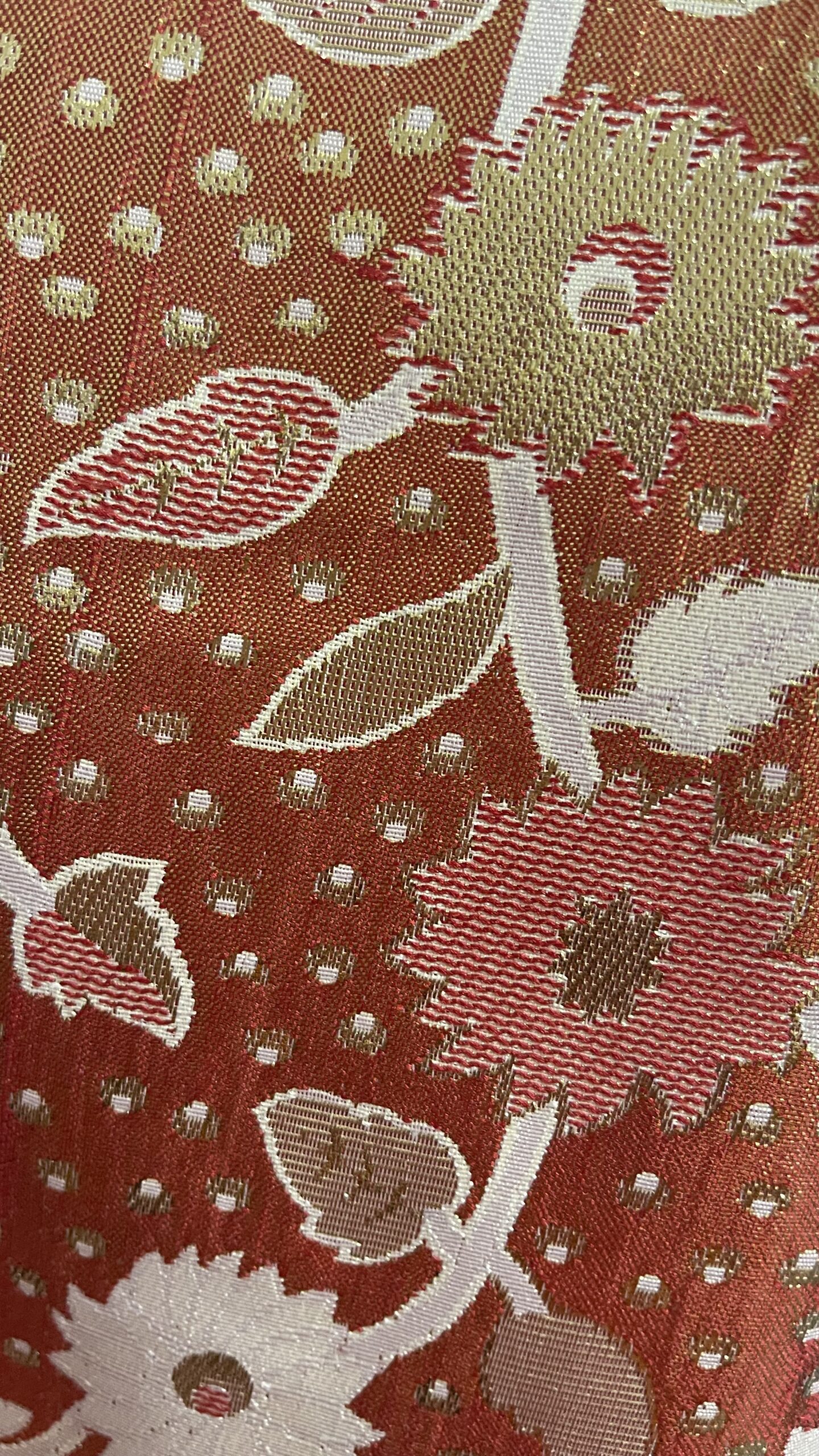 My first attempt at the “Sequin Saturday Jacket” is hanging in my sewing studio and is a gold and rose brocade fabric turned inside out so that the gold threads are featured.