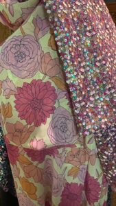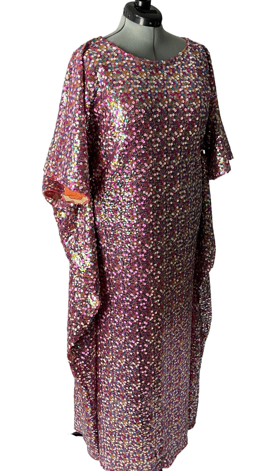 This week I created “The Charlie” pink sequin caftan dress out of a cute pink sequin fabric and lined it Flowers Get All The Powers.