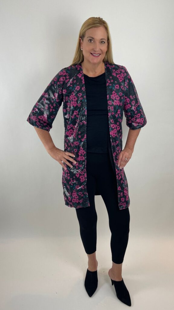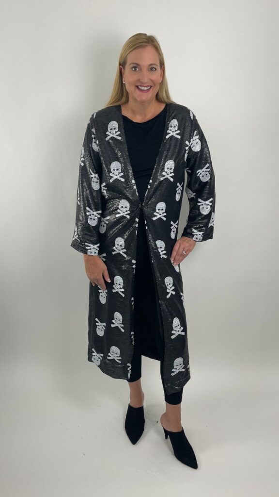 I created my first sequin jacket and it’s AWESOME!!!! I’m so proud of myself. And it has so much potential, I also decided to line all of my jackets to eliminate the itch of the sequins. My first jacket was a black and hot pink floral sequin jacket that I made and made elbow length sleeves, but the next jacket I made long and used this awesome skull and crossbones material that can be worn as a Halloween Sequin Jacket as well as a sequin jacket for Gasparilla! It’s important to me that my customers know the designs are flexible and multiple styles for jackets are available, and then fabrics can be used across styles. The first style I launched was The Sequin Saturday duster collection, and from there, I designed the Mardi Gras Sequin Duster, which is more of an a-line cut jacket (also lined). My latest Black Sequin Jacket is the Black Sequin Swing Jacket that has a velvet base. It looks so soft!